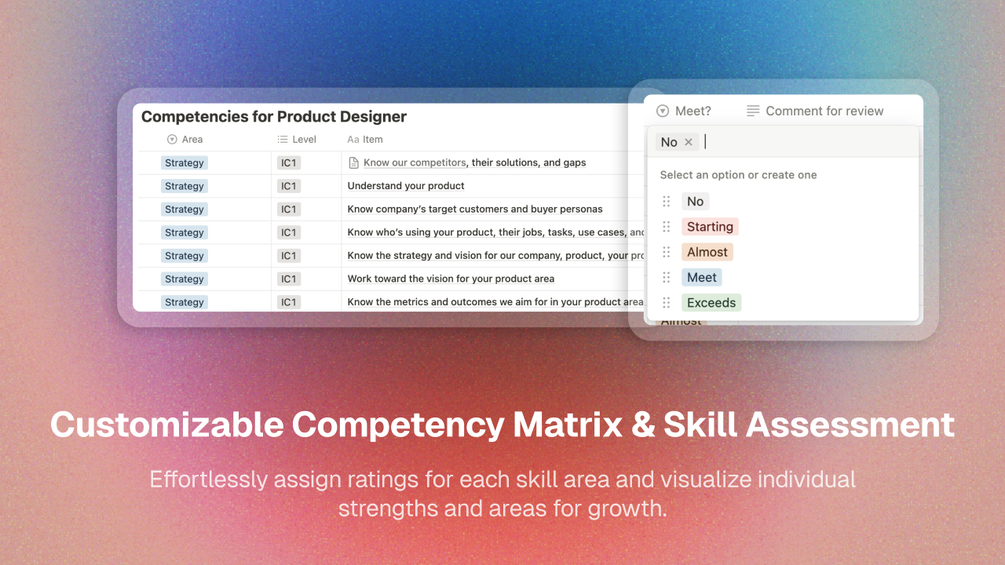 Revolutionize the way you manage and track the progression of your product designers with the Product Design Job Levels Tracker Notion Template. From defining job levels to assessing skill proficiency, streamline every aspect of your talent management process effortlessly. Say goodbye to the complexities of talent tracking and ensure your design team is thriving with confidence.